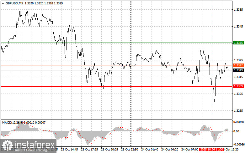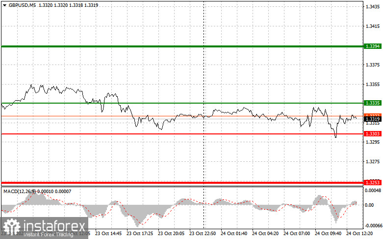 Scenario #1: I plan to sell the pound after the price breaks below the 1.3303 level (red line on the chart), which will likely lead to a rapid decline in the pair. The key target for sellers will be the 1.3253 level, where I plan to exit short positions and immediately open long positions in the opposite direction, expecting a 20–25-point rebound. The pound may drop sharply in the second half of the day.Important! Before selling, make sure that the MACD indicator is below the zero line and is just starting to move downward from it.