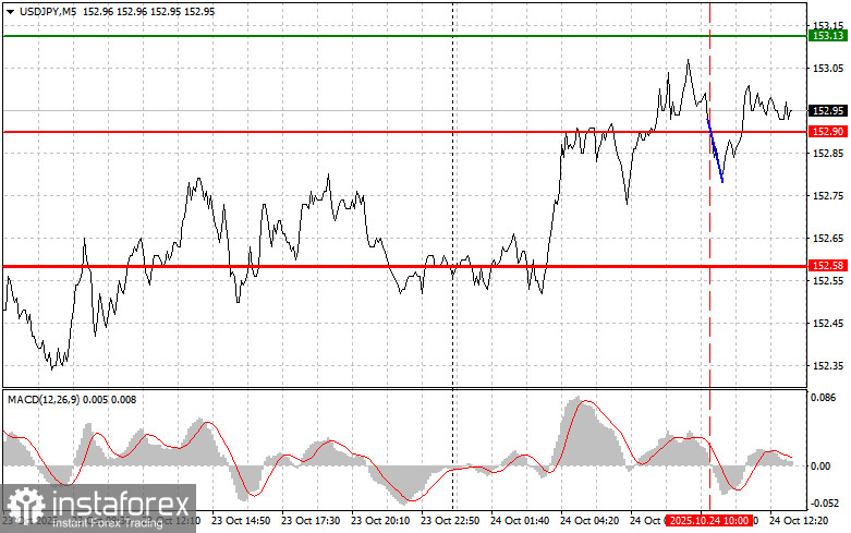The price test at 152.90 in the first half of the day occurred when the MACD indicator had just started moving downward from the zero line, confirming a valid entry point for selling the dollar — which resulted in only a 10-point decline.