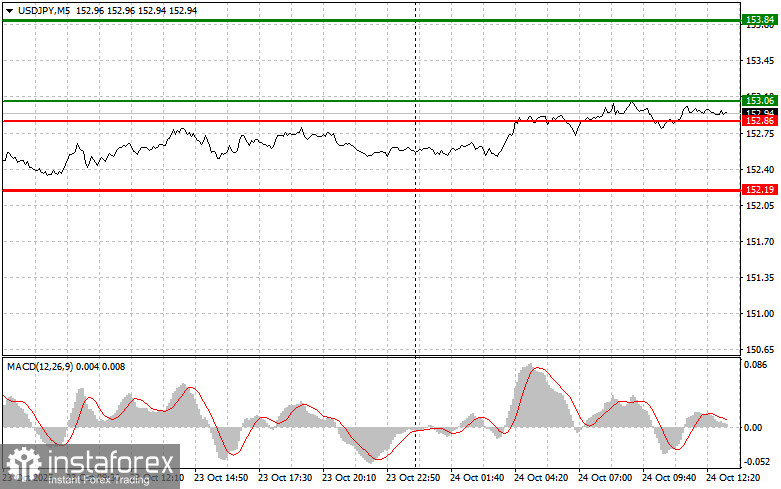 Scenario #2: I also plan to buy USD/JPY today in case of two consecutive tests of the 152.86 level, when the MACD is in the oversold zone. This will limit the pair's downward potential and trigger a market reversal upward. A rise can be expected toward the opposite levels of 153.06 and 153.84.